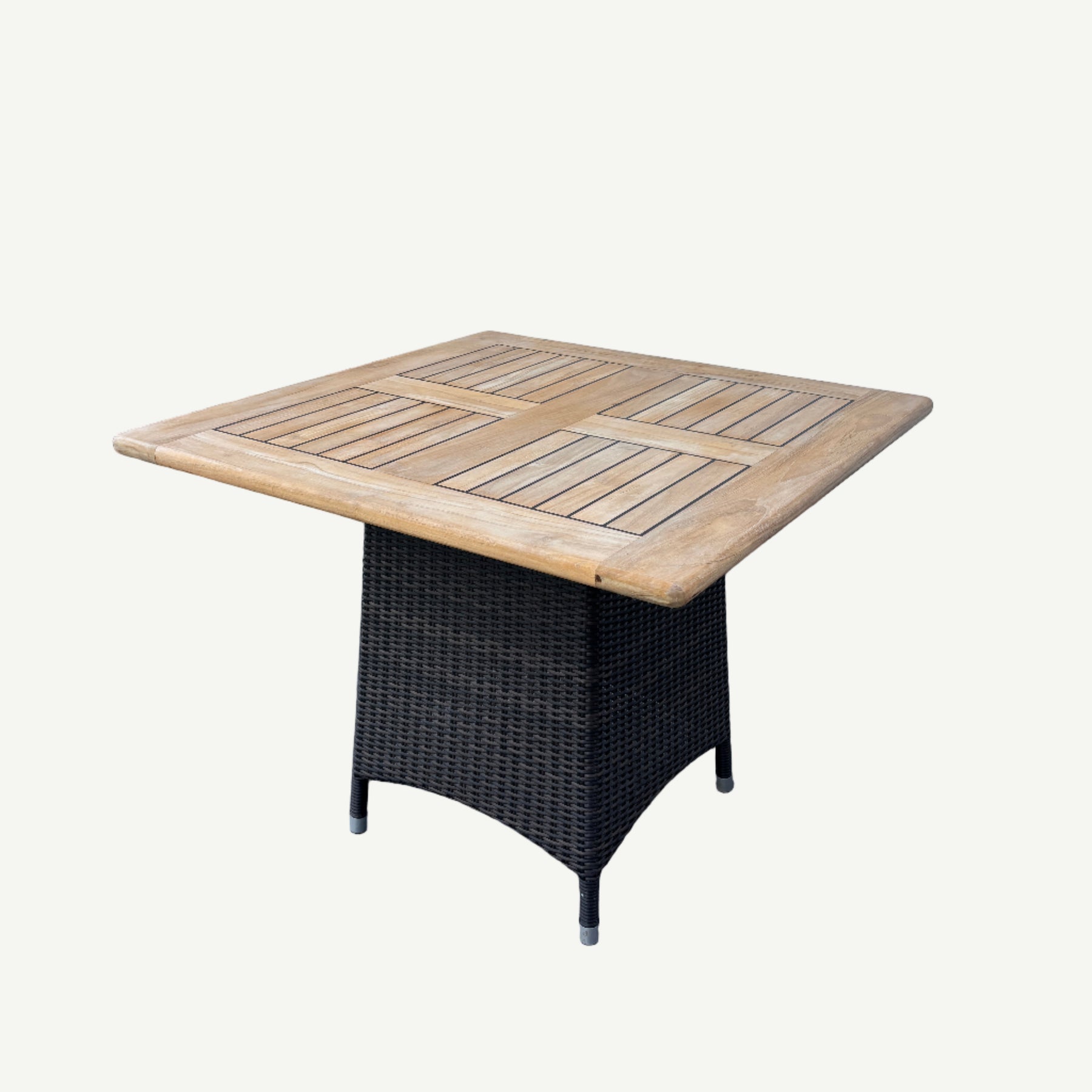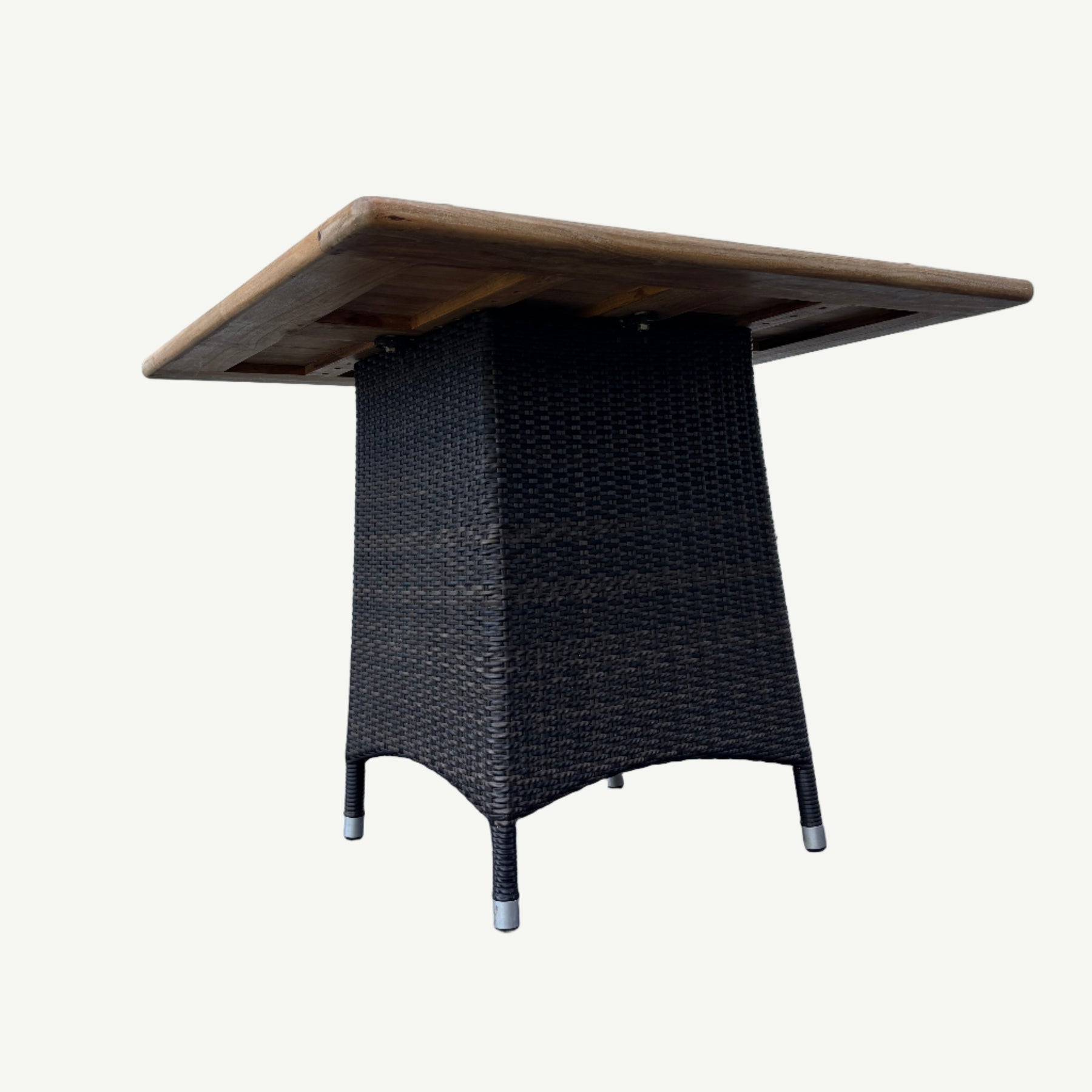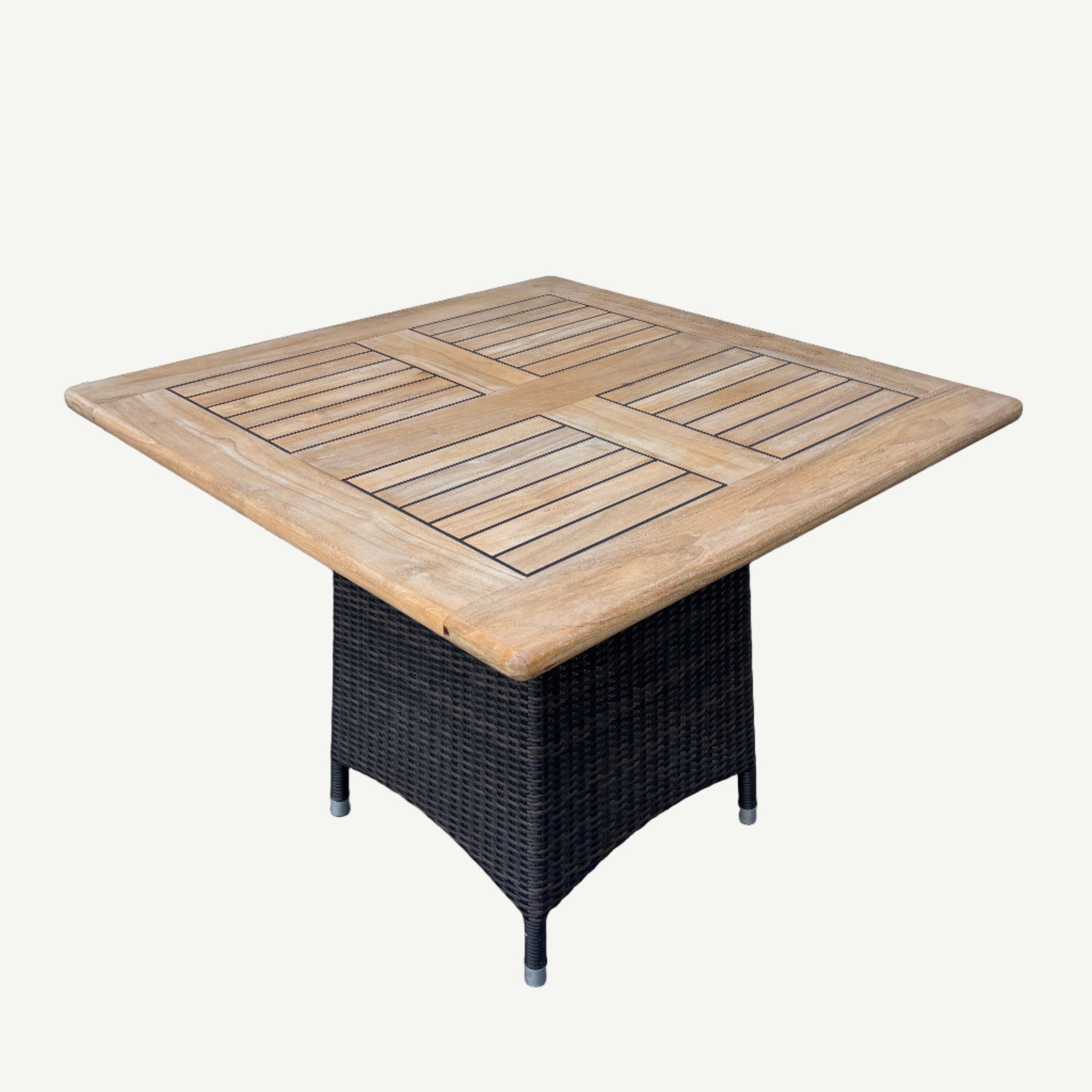 This Barcelona Dining Table exemplifies refined dining design with its pristine 90x90cm teak surface paired with an Antique Java wicker base.
