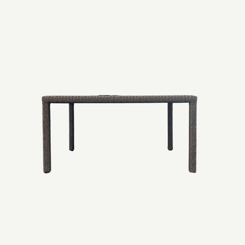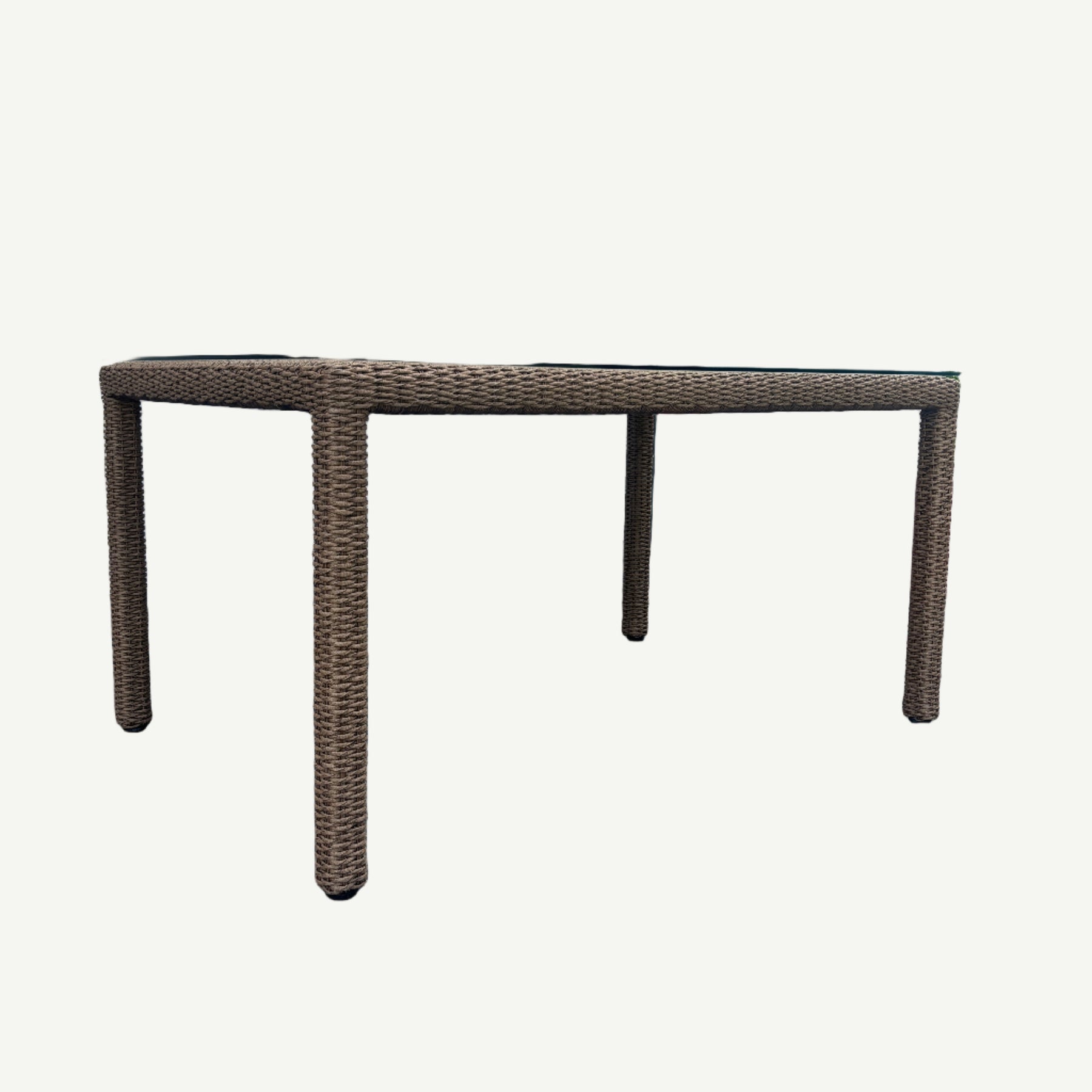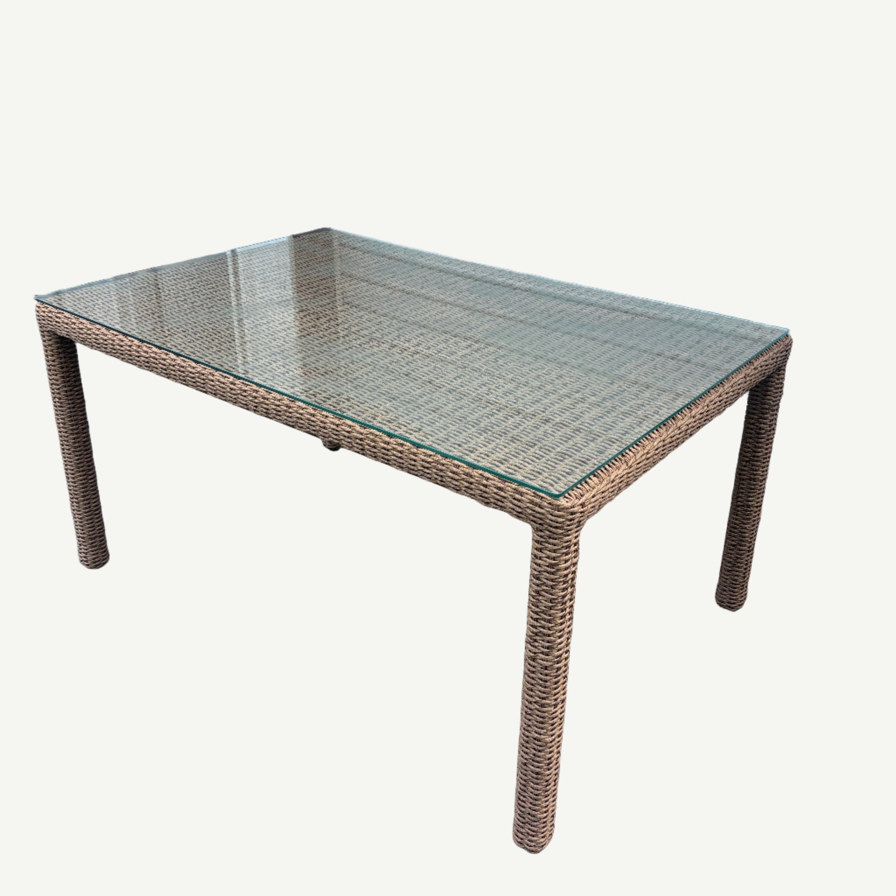 The Salerno Dining Table measures 100 x 150 cm, featuring a rectangular shape and finished in a distinctive Hyacinth Twist colour with a glass top.