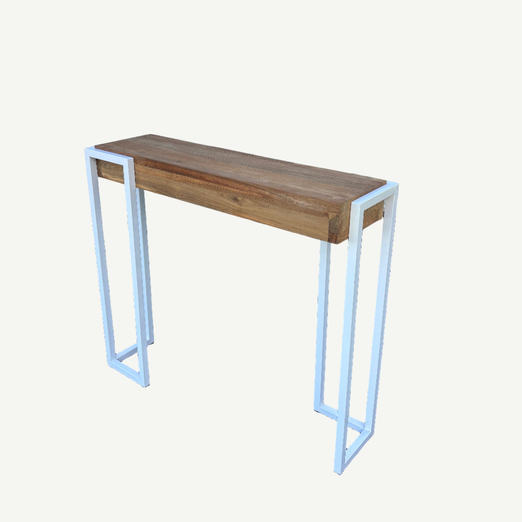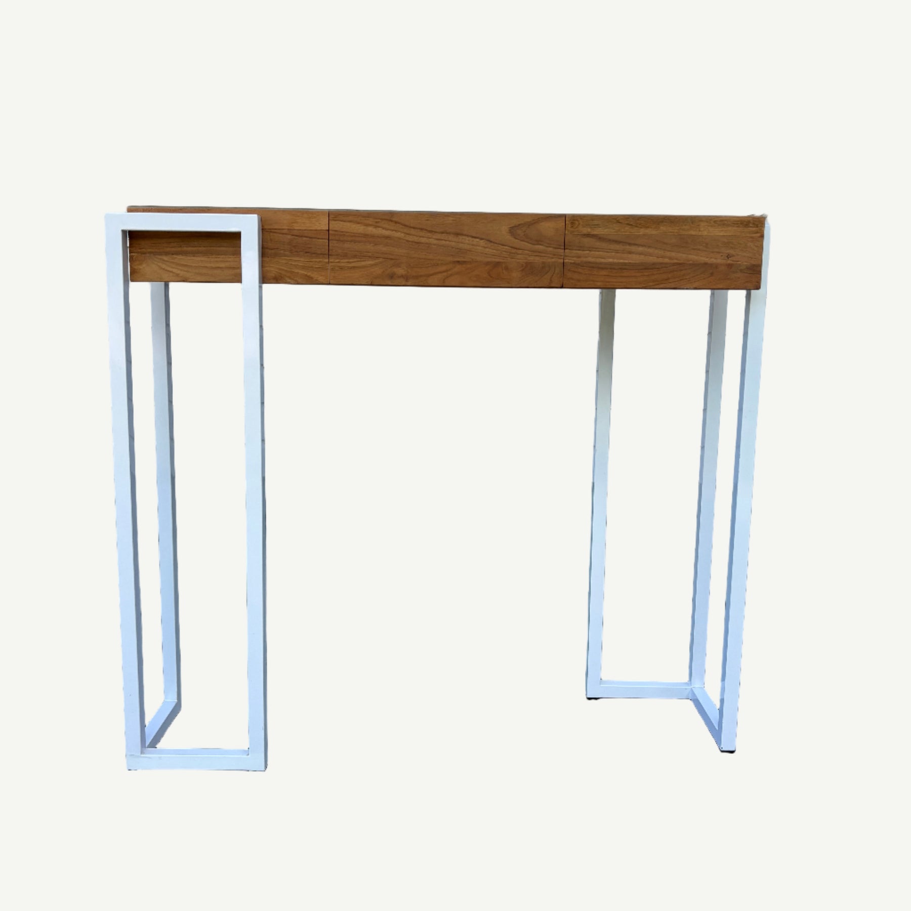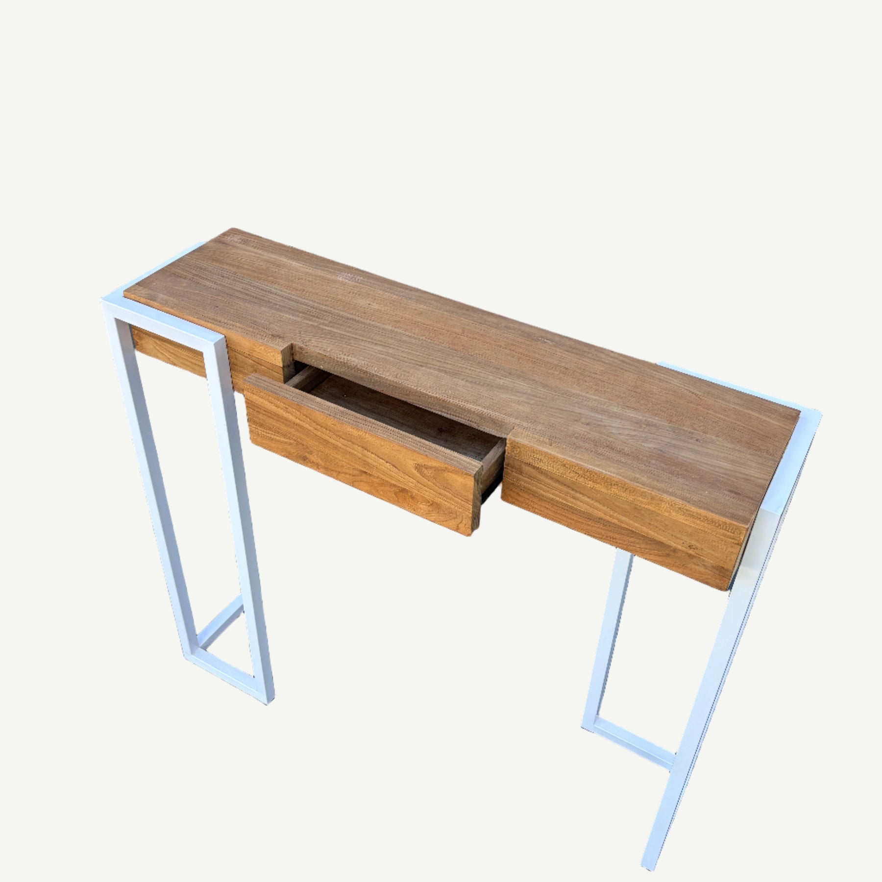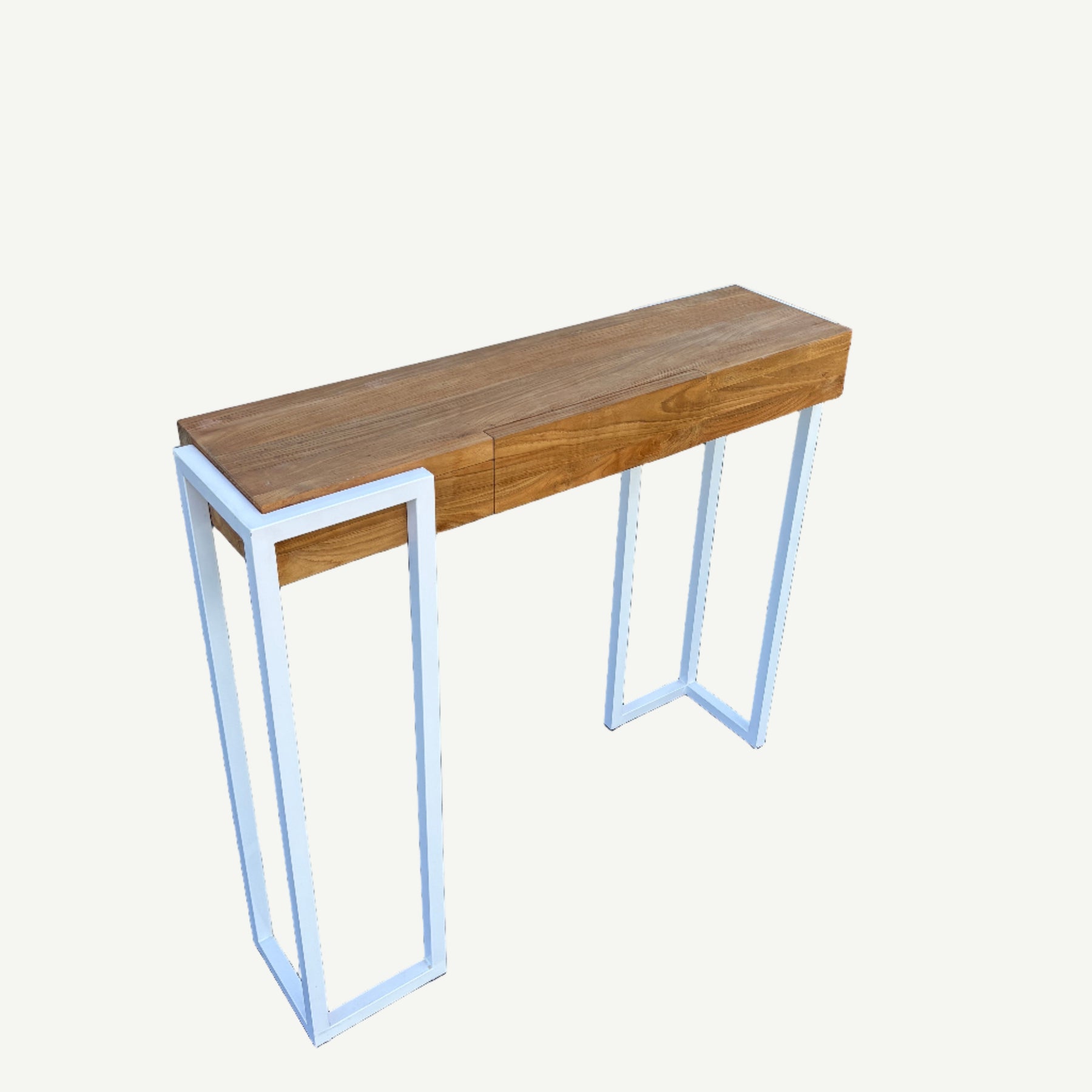 Contemporary console table featuring a white stainless steel frame paired with a teak top for display. One integrated drawer provides discreet storage, while its compact 100x30x90 cm footprint makes it perfect for entryways and smaller rooms demanding both style and practicality.