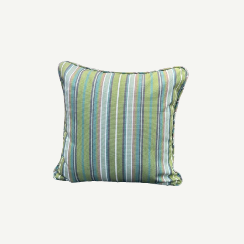 A 16-inch cushion cover in Sunbrella Foster Surfside with piping. Weather-resistant design suits indoor or outdoor spaces with coastal charm.