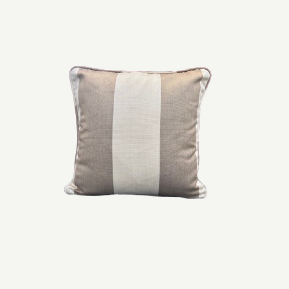 A 16-inch throw cushion in warm Sunbrella Regency Sand with elegant piping. Versatile neutral tone adds texture and comfort to any seating arrangement.