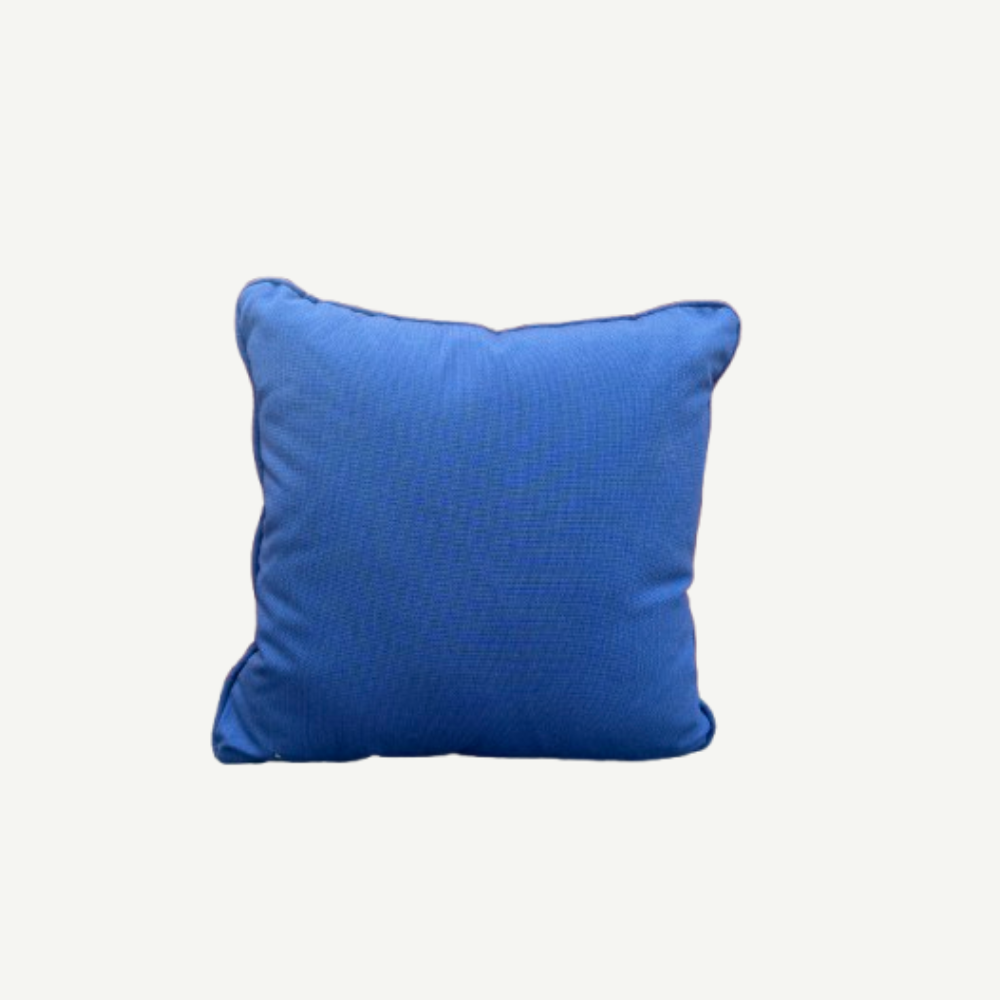 A 16-inch cushion in serene Sunbrella Riviera Blue with elegant piping. Weather-resistant fabric suits indoor living rooms or covered outdoor areas.