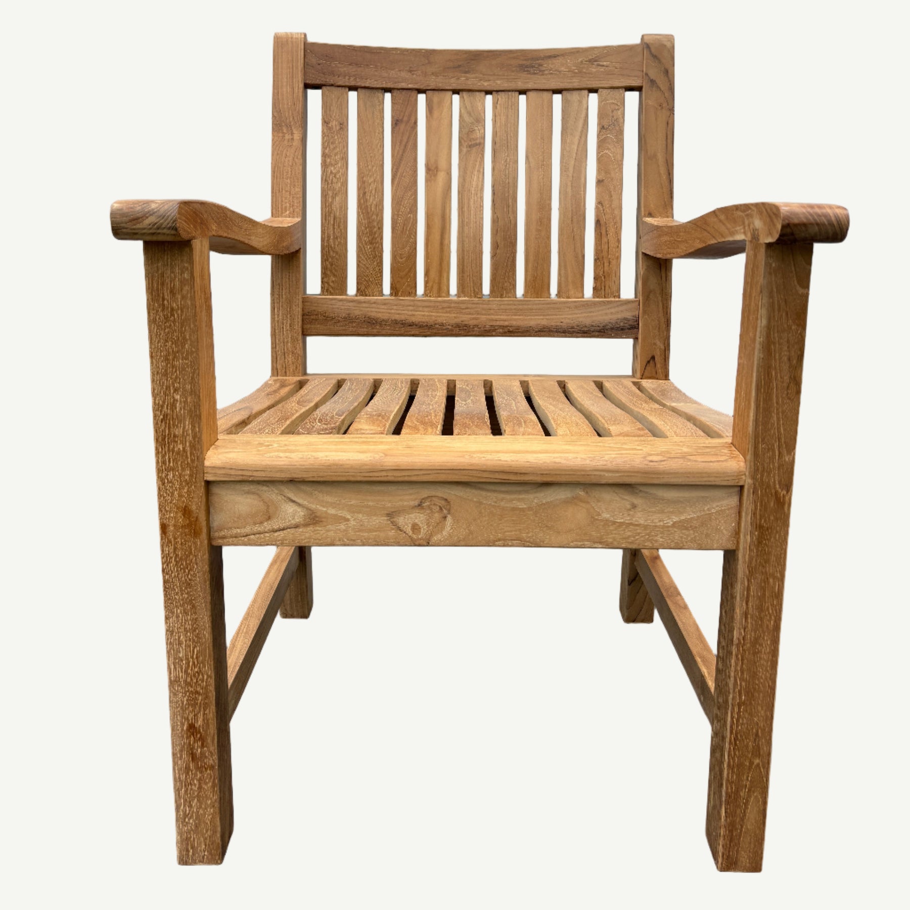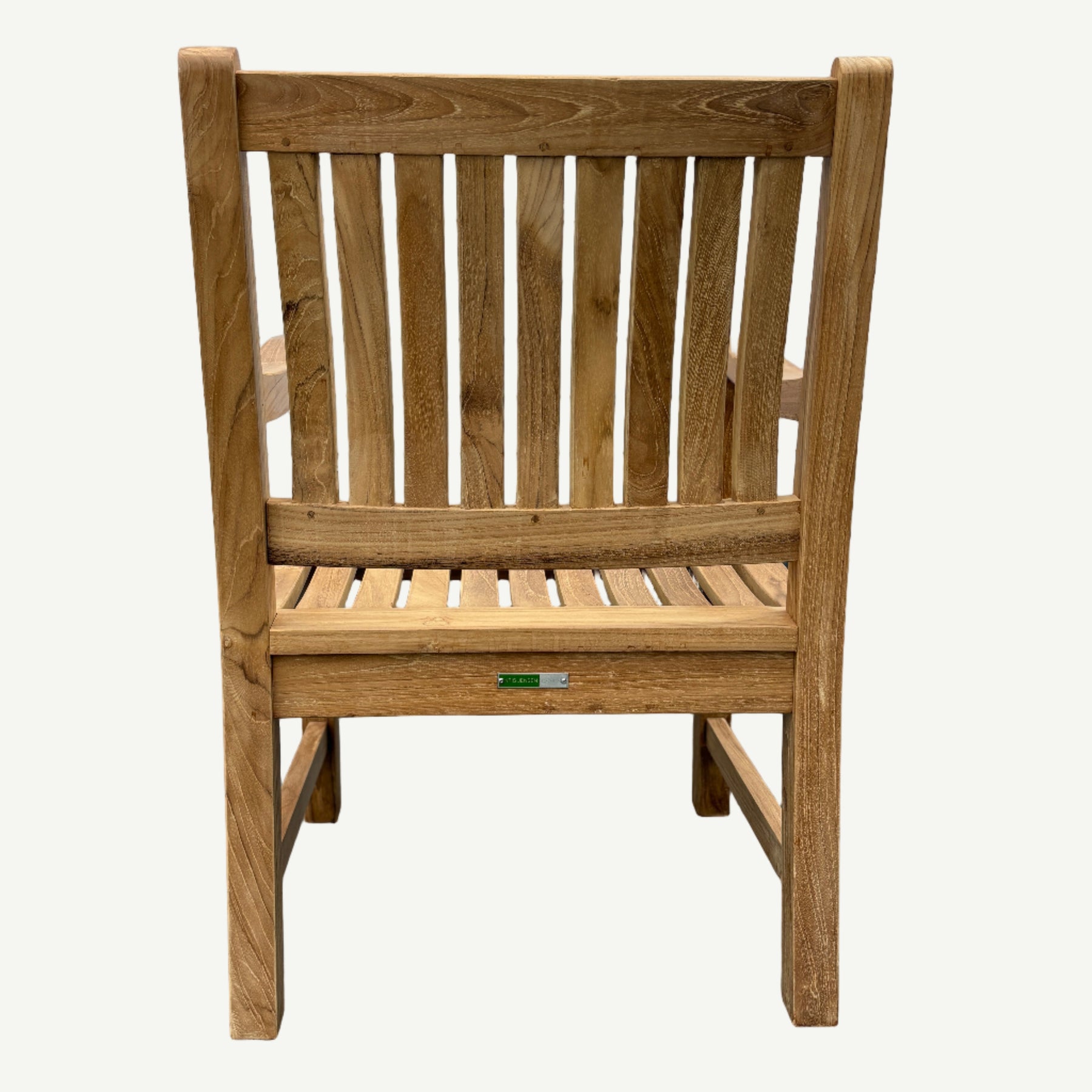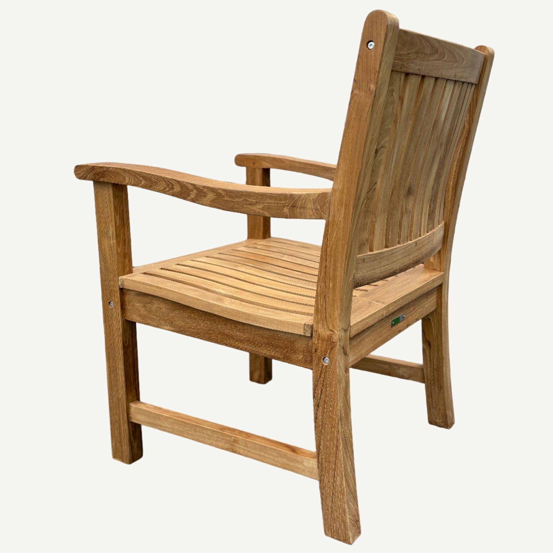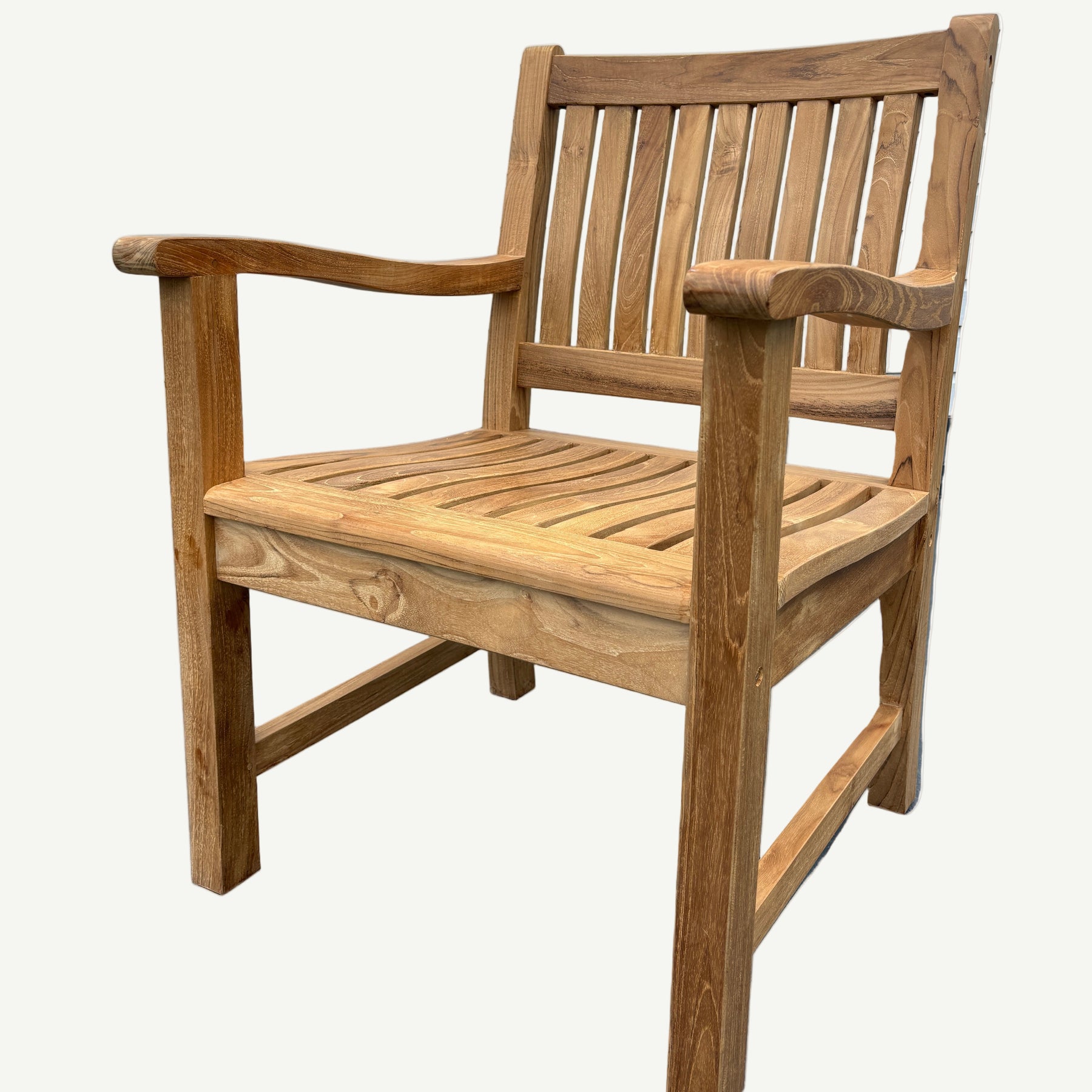 Discover the Manhattan Dining Arm Chair in a rich teak finish, combining timeless design with sturdy craftsmanship.