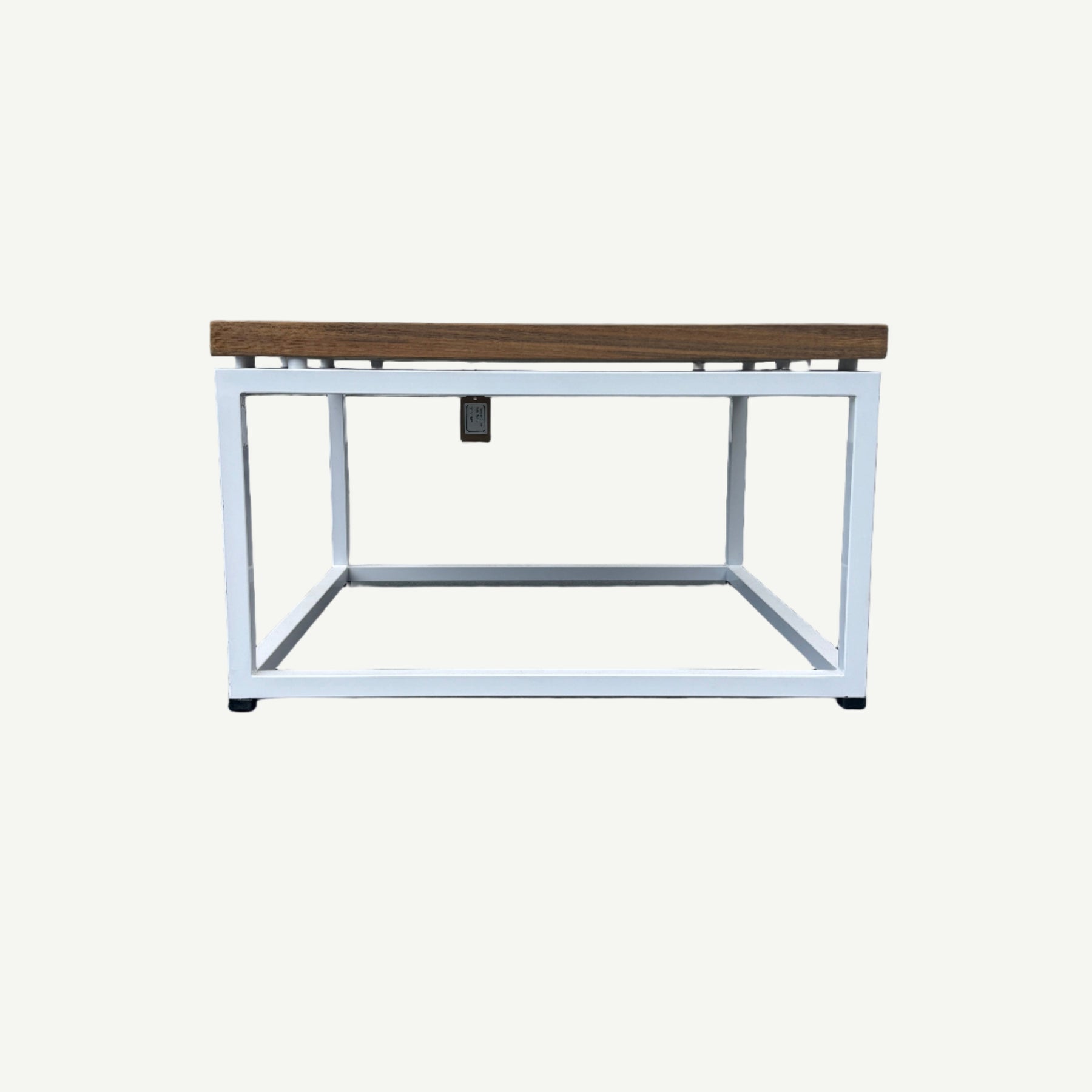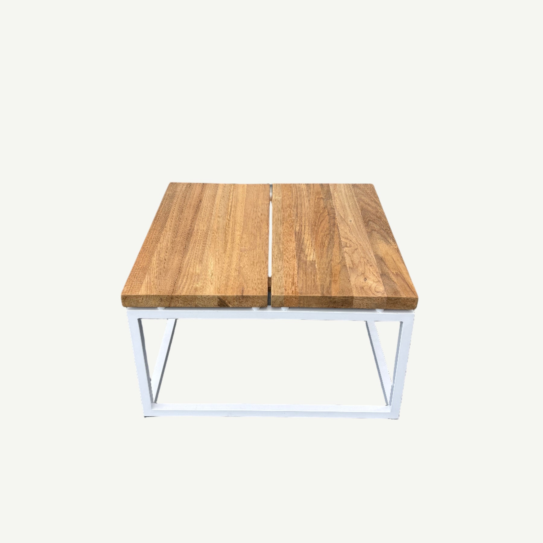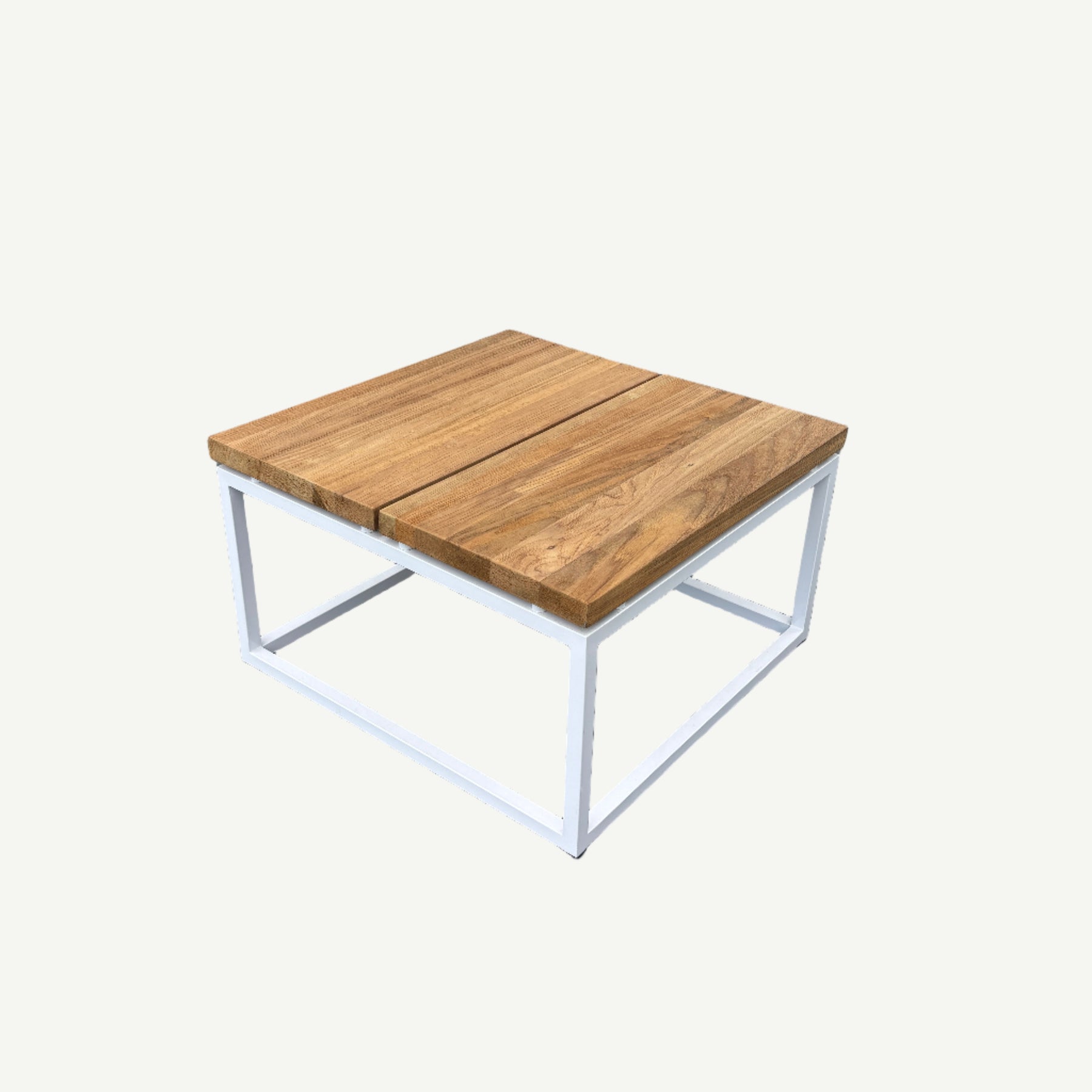 Compact side table combining a warm teak surface with crisp white stainless steel legs. At 55x55x33 cm, this cubic design offers a striking contrast of materials.