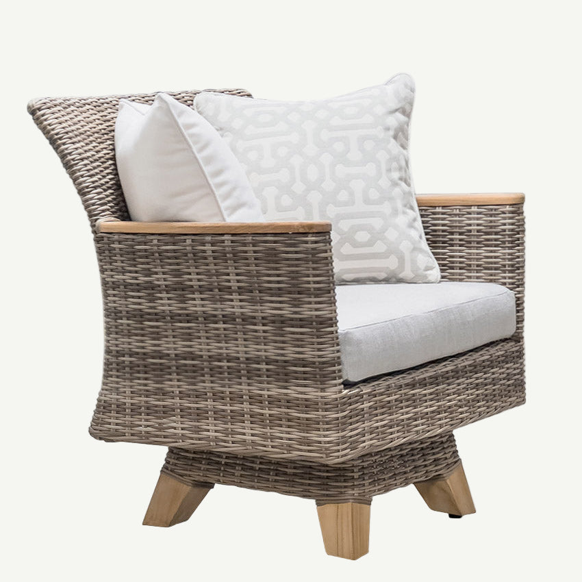 The Zanzibar Swivel Lounge Chair in Kubu offers stylish comfort with a smooth 360-degree swivel.